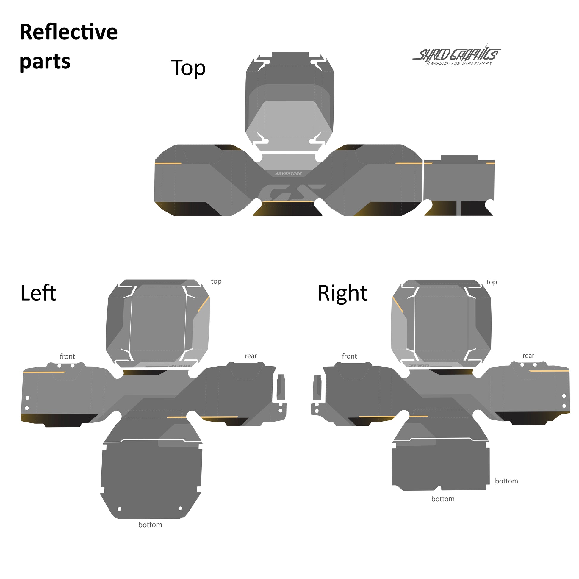 This kit contains graphics for the original BMW R1300GS Adventure cases. You can order a kit for the top case, the side cases or the complete set (better priced!)